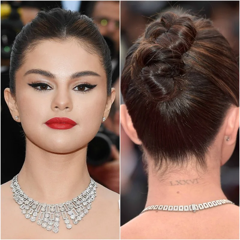 Le combo classique des lèvres rouges avec surligneur noir style oeil de chat, c’est toujours winner. Nous sommes particulièrement enchantés par le chignon de Selena, qui semble être une série de noeuds bien fixés.